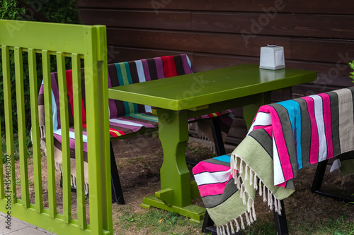 table, bench, striped, bedcover, cafes, pavement, fabric, coloured, many-coloured, green, paint, greenery, fence, eatery, food, serving, interior, napkin