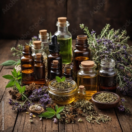A wooden table filled with natural remedies, essential oils, and dried herbs.