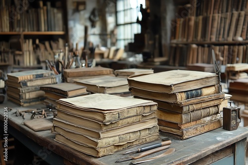 A wooden table in a workshop with stacks of antique books, tools, and a window in the background.