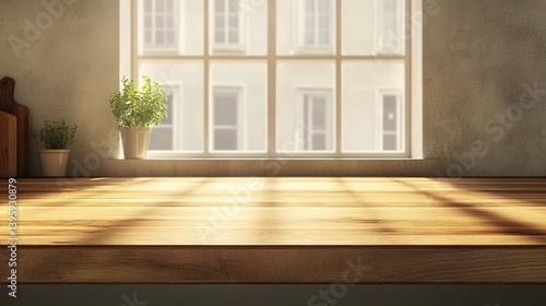 A wooden table in the foreground with sunlight casting shadows through a window, potted green plants and kitchen utensils on the windowsill behind