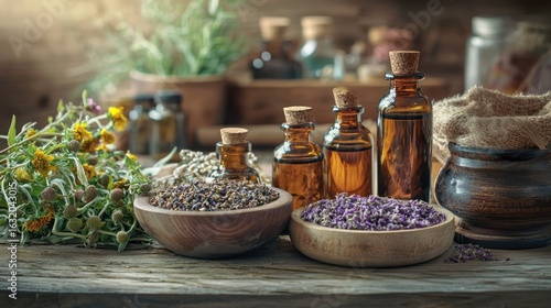 A wooden table with a variety of herbal and aromatic oils, herbs, and spices in glass bottles and bowls, with a rustic wooden background.