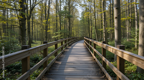 A wooden walking path Bor na Czerwonem nature reserve in Nowy Targ in Poland