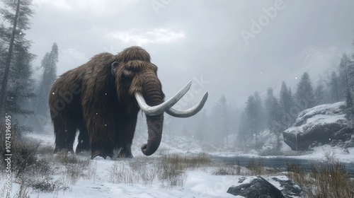 A woolly mammoth in the icefields, standing tall in the cold landscape, with thick brown fur and large tusks.