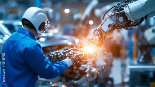 A worker in a factory setting, operating a robotic arm welding a car part