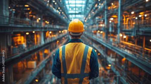 A worker in a hard hat and vest looks out at a bustling industrial facility.