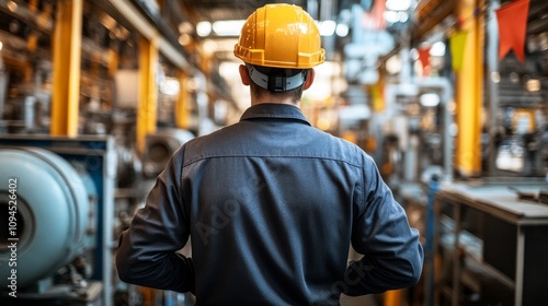 men at work, factory, hard, hat, yellow, safety, industrial, plant, manufacturing, production, machinery, equipment, metal, pipe, wire, cable, tool, construction, engineering, maintenance, repair, inspection, operation, automation, technology, innovation, progress, industry, labor, manpower, blue, collar, uniform, back, walking, aisle, background, blurred, sharpened, depth, of, field