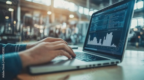 A worker in an industrial setting uses a laptop displaying advanced analytics, emphasizing precision and high-tech operations