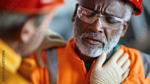 A worker in an orange safety uniform, hard hat, and gloves receives guidance from another person, emphasizing caution, safety, and teamwork at a busy industrial worksite.