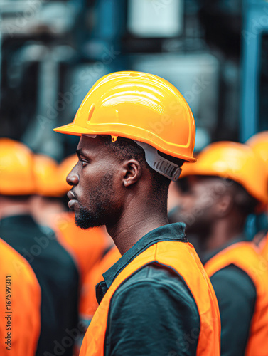 A worker in an orange vest and yellow hard hat stands among colleagues, focused and ready for tasks in a construction or industrial environment.