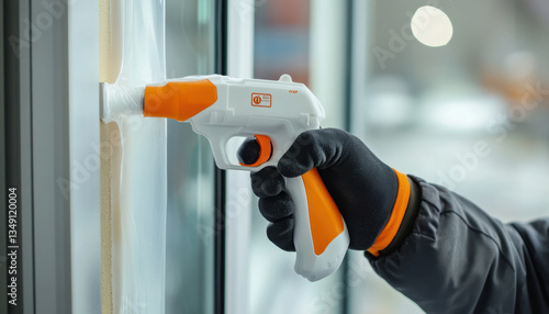 A worker in gloves uses an air cushion tool to apply protective cushioning on a surface. This innovative method enhances safety and efficiency in construction environments