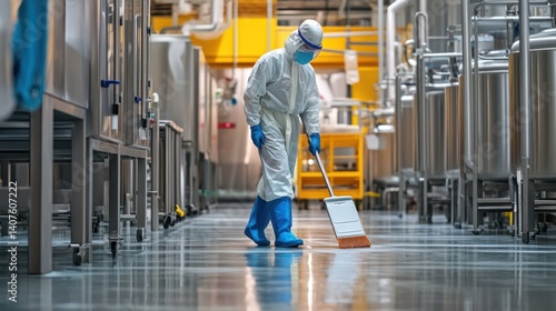 men at work, protective, gear, cleaning, floor, facility, food, processing, sanitation, hygiene, industrial, manufacturing, equipment, stainless, steel, tank, container, aisle, maintenance, safety, supply, tool, broom, glove, boot, uniform, cleanliness, modern, production