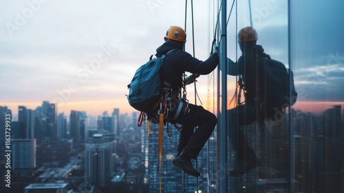 A worker in safety gear is rappelling down the side of a tall building, showcasing skill and focus. The background reveals a stunning sunset over a bustling city skyline
