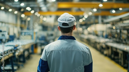 A worker in uniform checking inventory on the assembly line, back turned to the camera, close-up shot with detailed focus on the industrial environment