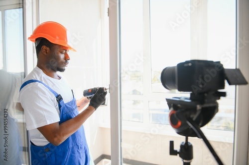 A worker inserts plastic windows and records a video on a camera. Builder's blog