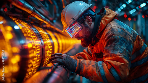 A worker inspects industrial machinery with bright orange lights in a dark environment, showcasing safety gear and attention to detail.