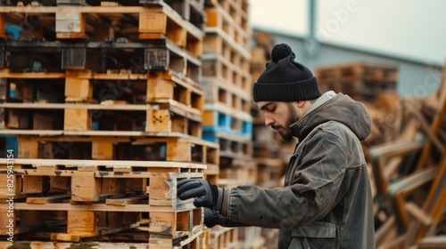 A worker organizing and stacking wooden pallets to be picked up for recycling.