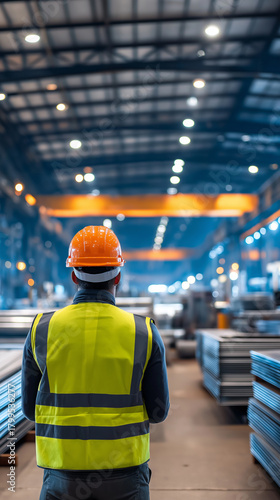 A worker wearing a helmet and safety vest stands inside a large industrial warehouse.