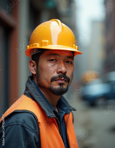 A worker wearing an orange hard hat and safety vest stands in front of the building.
