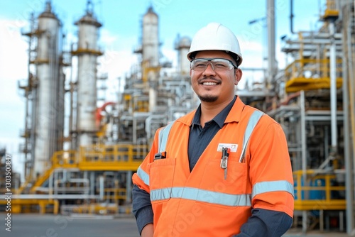 A worker wearing an orange safety suit and helmet stands confidently at an industrial facility. The background shows several tall structures and pipes indicating an active environment