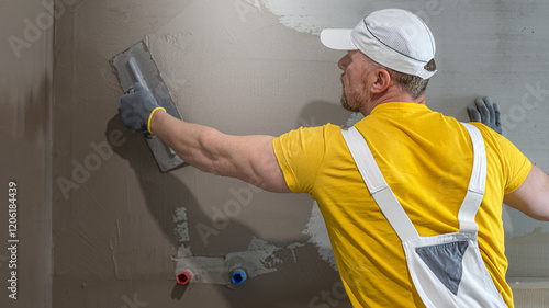 A worker when applies a liquid membrane on shower wall before bathroom tiling. Foolproof waterproofing for a tile bathroom.