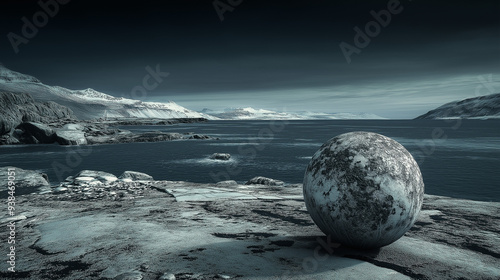 A World Apart: A solitary sphere rests on a desolate, rocky shore, its surface mirroring the craters and textures of a distant moon. The frigid blue waters and ominous sky create a sense of isolation