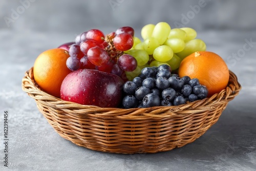 A woven basket filled with an assortment of fruits oranges grapes blueberries and a red apple on a gray surface