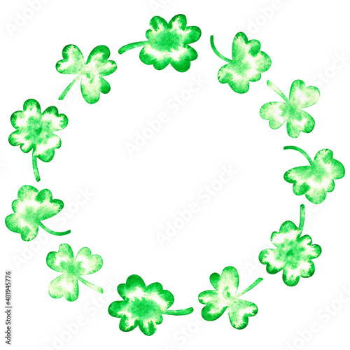 chaplet, clover, spot, shamrock, 4, leaf, trefoil, leaf, green, art, isolated, watercolor, illustration, white, background, irish, ireland, saint, st, patrick, day, round, circle, frame, march, superstition, blot, smudge, stained, greeting card, celtic, festival, party, holiday, fortune, cut-out, element, lucky, symbol, nature, herbal, grass, card, invitation, traditional, celebration, event, logotype, eco