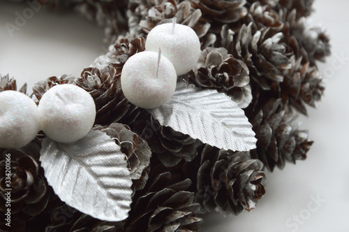 A wreath of cones. Decoration for Christmas and New year. Beautiful decor for a festive interior.