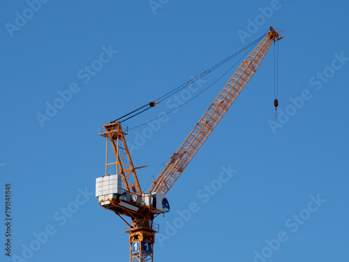 a yellow construction crane at a high rise construction site on a clear blue sky