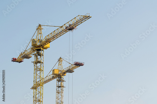 A yellow high-rise building crane against a blue sky builds multi-storey apartment buildings using modern technologies of metal, concrete and brick according to an architectural project