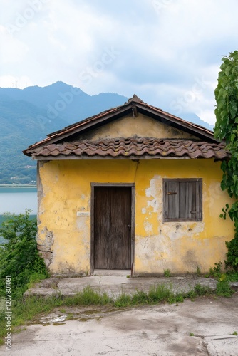 yellow, house, brown, door, sit, dirt, road, tree, body, water, architecture, tour tourism, travel, nature, old, building, town, europa, traditional, wall, landscape, beautiful, view, village, window, home, exterior, colourful, wooden, summer, background, vacation, blue, white, lake, street, mountain, green, stone, vintage, detail, wood, scenery, destination, facades, red, frame, brick