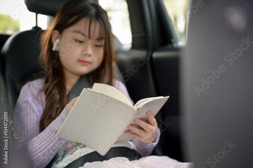 children, girl, young, asian, daughter, adorable, cute, childhood, children, children, female, innocence, student, car, inside, travel, school, vehicle, sitting, seatbelt, trip, transport, driving, safety, road trip, family, journey, carefree, morning, listening, music, earbud, song, enjoyment, fun, reading, book, cartoon, education, studying, learning, sharpened, condensed, elementary school