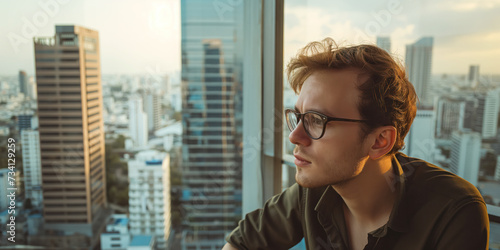 contemplation, city landscape, young adult, goggles, window, urban, golden hour, thoughtful, male, skyline, building, sunset, introspection, tower block, perspective, indoor, view, lifestyle, metropolis, skyscraper, downtown, business district, serious, pensive, meditative, ambience, light, mood, solitude, calm, peaceful, daydream, planning, future, aspiration, alone, atmosphere, looking, observing, sky, office, environment, casual attire, quiet, residential, evening