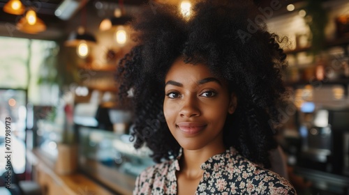 A young Afro-American woman with natural curly hair gives a subtle, confident smile in a warmly lit café