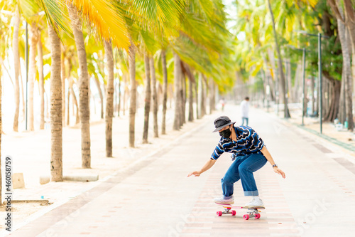 A young Asian man in a striped shirt and trousers is figure skating on a beach filled with coconut palms, during a clear sky time. and no people beach , surf skating, Bangsaen, Thailand