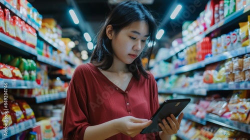 A Young Asian supermarket employee checks product quality while holding a digital tablet. Asian Millennial Woman Working in Home Convenience Store use of technology