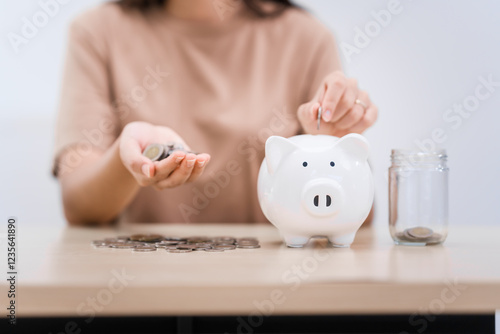 A young Asian woman in a light brown t-shirt, sitting with a piggy bank, coin, calculator, mobile, and pen. She focuses on financial stability, saving for emergencies, education, and future goals.