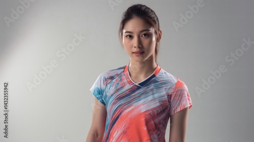 portrait, woman, asian, sporty, athlete, smile, casual attire, modern, fashion, athletic, vibrant, shirt, abstract, pattern, red, blue, white, short, sleeve, ponytail, hair, dark, light, skin, studio, lighting, soft, shadow, clean, minimal, background, sharpened, hi-res, pose, confident, fresh, style, activewear, fit, graceful, energetic, simple, bright, apparel, trendy, sleek, relaxed, youthful, person