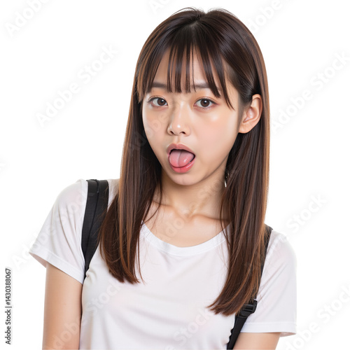 A Young Asian Woman with Long Hair Posing Playfully in a White T-Shirt and Shoulder Bag Against a Dark Background