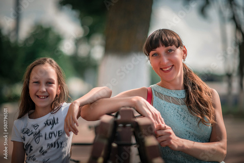 A young beautiful dark-haired mother is resting in a summer park with her young daughter.