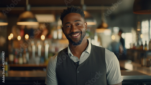 A young black smiling bartender or waiter standing indoors in a bar or restaurant while wearing a vest.