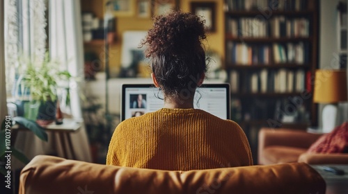 woman, black, curly hair, couch, computer, living room, cosy, home office, sharpened, reader, young adult, indoor, relaxation, greenery, warm colors, study, casual attire, technology, interior design, bookshelf, natural light, concentration, furniture, comfort, urban living, creativity, innovation, inspiration, feminine, multicultural, reading, education, introspection, studying, leisure, serenity, motivated, home decor