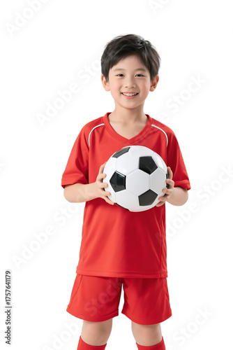 A young boy in a red soccer uniform is holding a soccer ball, representing a youthful sports enthusiast.