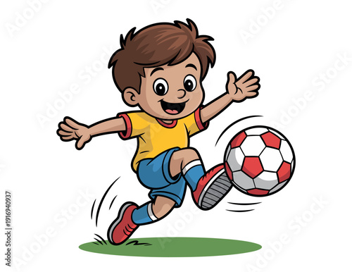 boy, soccer, ball, kicking, happy, energetic, playful, youth, sport, football, game, fun, green, field, grass, action, motion, movement, red, yellow, blue, cartoon, illustration, children, children, active, play, recreation, leisure, joy, excitement, enthusiasm, vibrant, colourful, dynamic, speed, agility, skill, athletic, sporty, lively, spirited, carefree