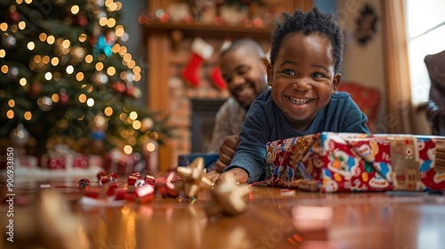 black hair, dark skin, smile, children, boy, indoor, teeth, realistic, open, gift, open mouth, depth of field, toy, blue shirt, floor, wrapping paper, christmas, grin, laugh, gift box, background, shirt, christmas tree, enclosed