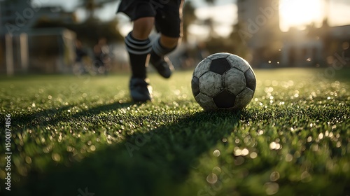 A young boy runs toward a soccer ball on a green field du a sunny afternoon, practicing his skills and enjoying the outdoors in a healthy lifestyle.