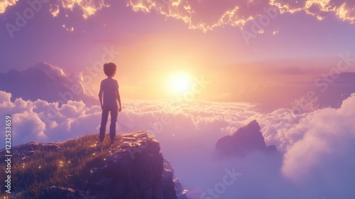 A young boy stands on a cliff, gazing at a stunning sunset above a sea of clouds, evoking a sense of wonder and adventure.