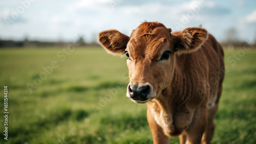 A young brown calf standing in a green grassy field. Close-up portrait of a cute baby cow in a pasture. Copy space for text.
