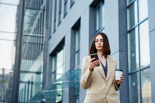 A young brunette girl against the backdrop of a business center, office center. On the go, he reads the news from his smartphone.