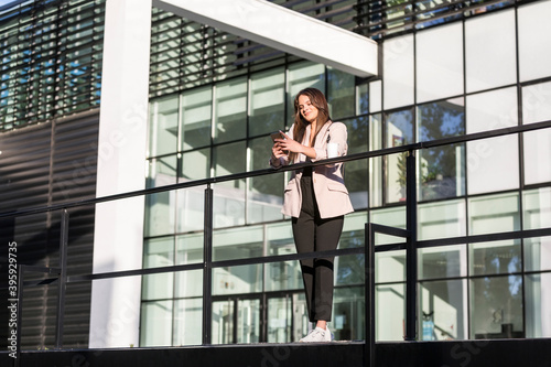 business, posing, fashion, modern, architecture, background, caucasian, young, smiling, city, female, technology, positive, modern architecture, long hair, standing, spring, glasses, fence, railing, building, jacket, leaning, hot drink, coffee cup, sun ray, sun, smartphone, phone, typing, mobile, woman